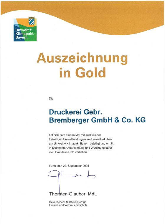 Für den jahrelangen Einsatz und das unermüdliche Bestreben für umwelt- und ressourcenschonendes Arbeiten und Handeln, erhielten wir in diesem Herbst eine besondere Anerkennung von der bayrischen Staatsregierung. In einem feierlichen Akt wurde uns vom Bayrischen Staatsminister für Umwelt und Verbraucherschutz, Thorsten Glauber, die „Auszeichnung in Gold“ überreicht.